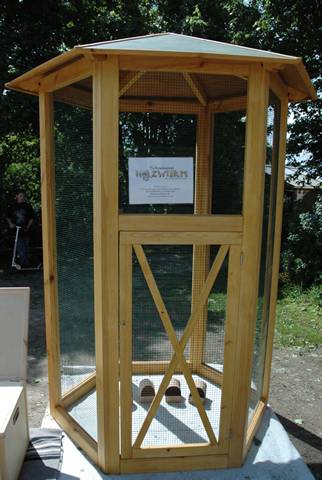 Eine sechseckige Voliere die auch in kleinen Gärten Platz findet und trotzdem eine artgerechte Haltunge ermöglicht.